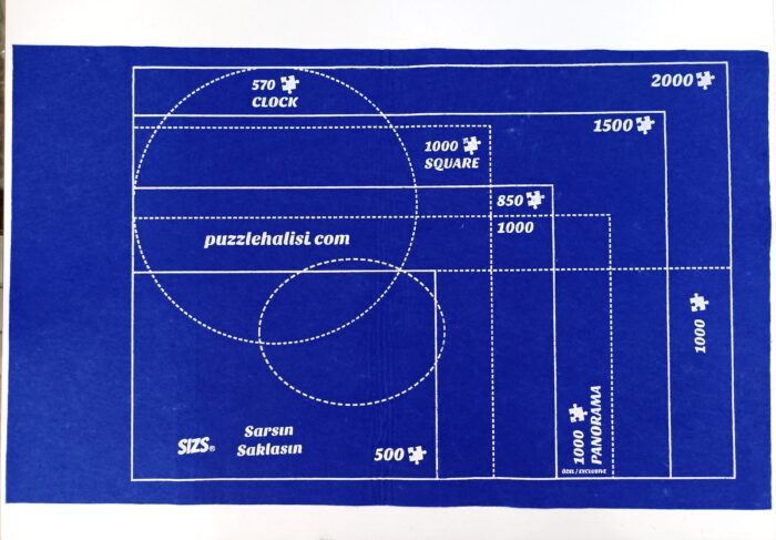 Üzerindeki referans çizgiler evrensel boyutlarla uyumludur: 500 – 850 & 1000 – 1500 – 2000 1000 panaroma – 1000 özel / exlusive panaroma 570 yuvarlak saat – 850 ayna Puzzle halısı 2000’lik boyutu: 2000‘lik için: 75cm x 125cm dir. ; Bu ürün 2000 parçaya kadar tüm puzzle boyutları için uygundur. ; Farklı boyutta ürünleri belli boyutlardan daha büyük puzzlelar ile ilgilenmeyen müşterilerimize seçim imkanı vermek, fiyat ve yerden tasarruf etmelerini sağlamak için ürettik. ; Paket 1 adet puzzle halısı, 1 adet sarma rulosu, 2 adet kilitli lastik ve 1 adet gamboç çanta içermektedir. ; Siparişler en geç 1 iş günü içerisinde anlaşmalı kargo firmasına teslim edilir. ; kargo ücretsizdir. ; Sızs puzzle halısı üretilen en kaliteli puzzle halısıdır. ; Rengi, boyutu ve çantasına kadar herşey kullanıcı düşünülerek hazırlanmıştır. ; Ürünün fiyatı aracısız direk üreticiden olduğu için uygundur. ; Her puzzle severin evinde bulunması gereken bir ürün. ; Sizi yer ve zaman kısıtlamalarından, etraftaki afacanların ve tüylü dostların korkusundan, ideal yer gibi görünüp ilk misafirle ihanet eden masalardan, diğerleriyle birleşmektense gezip kaybolmayı yeğleyen parçalardan kurtaracak. ; Tüm ürünlerde 500 ile ürün boyutu arasındaki tüm puzzleları rahatlıkla yapabilirsiniz. ; Farklı boyutta ürünleri belli boyutlardan daha büyük puzzlelar ile ilgilenmeyen müşterilerimize seçim imkanı vermek, fiyat ve yerden tasarruf etmelerini sağlamak için ürettik.;