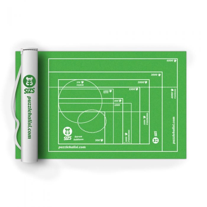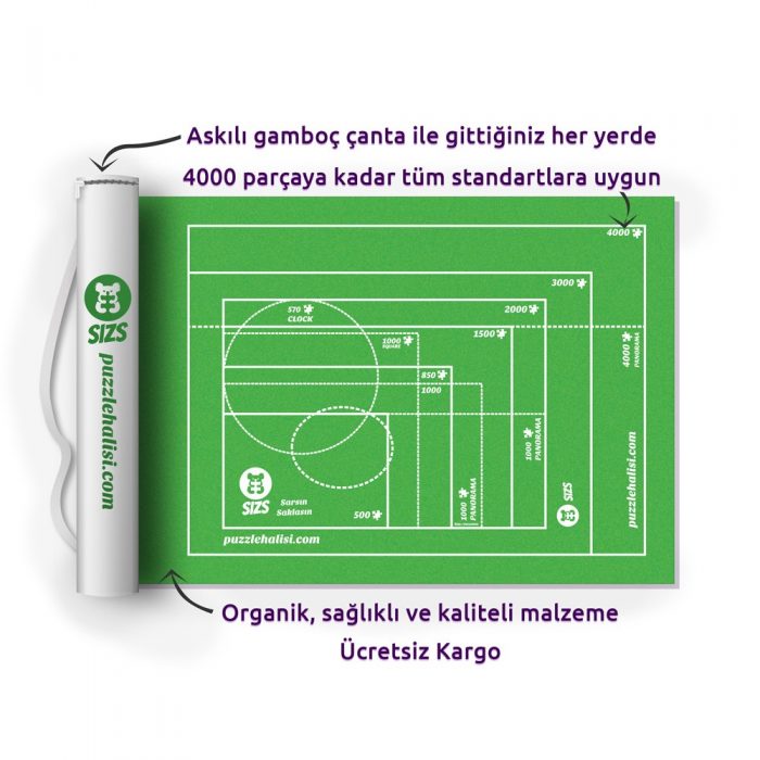 Üzerindeki referans çizgiler evrensel boyutlarla uyumludur: 500 – 850 & 1000 – 1500 – 2000 – 3000 – 4000 1000 Panaroma – 1000 Özel / Exlusive Panaroma 4000 Panaroma 570 Yuvarlak Saat – 850 Ayna Puzzle Halısı 4000’lik Boyutu: 110cm x 185cm dir. Bu Ürün 4000 parçaya kadar tüm puzzle boyutları için uygundur. Farklı boyutta ürünleri belli boyutlardan daha büyük puzzlelar ile ilgilenmeyen müşterilerimize seçim imkanı vermek, fiyat ve yerden tasarruf etmelerini sağlamak için ürettik. Paket 1 adet puzzle halısı, 1 adet sarma rulosu, 4 adet kilitli lastik ve 1 adet kamboç çanta içermektedir. Siparişler en geç 1 iş günü içerisinde MNG hızlı kargoya teslim edilir. Kargo ücretsizdir.;